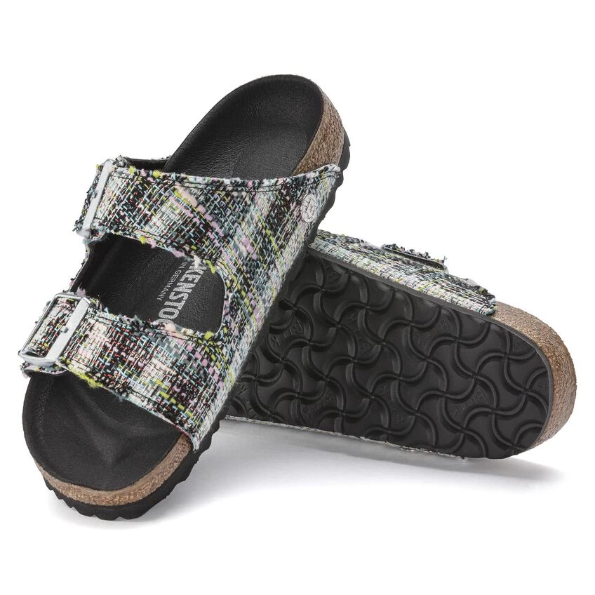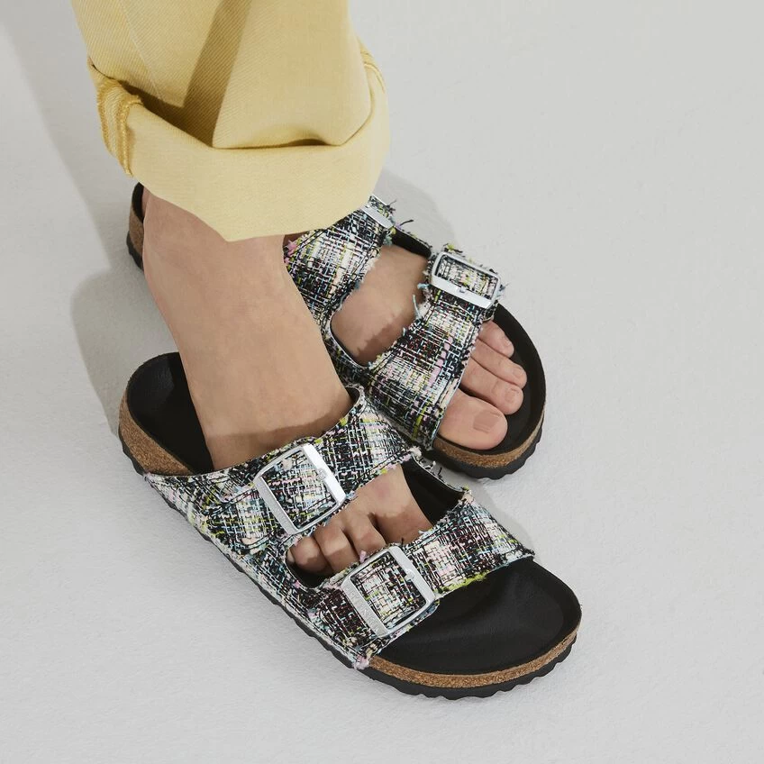 A colorful woven upper transforms the Arizona’s iconic, two-strap design into a be-seen style. Inspired by tweed, soft pastels create a weave that’s perfect for the season—and 100% vegan. A smooth black microfiber footbed lining softens the feel from the inside, matching back to the sole to complete the premium look. It’s finished with classic BIRKENSTOCK design elements, like a contoured cork-latex footbed that shapes to you with wear.