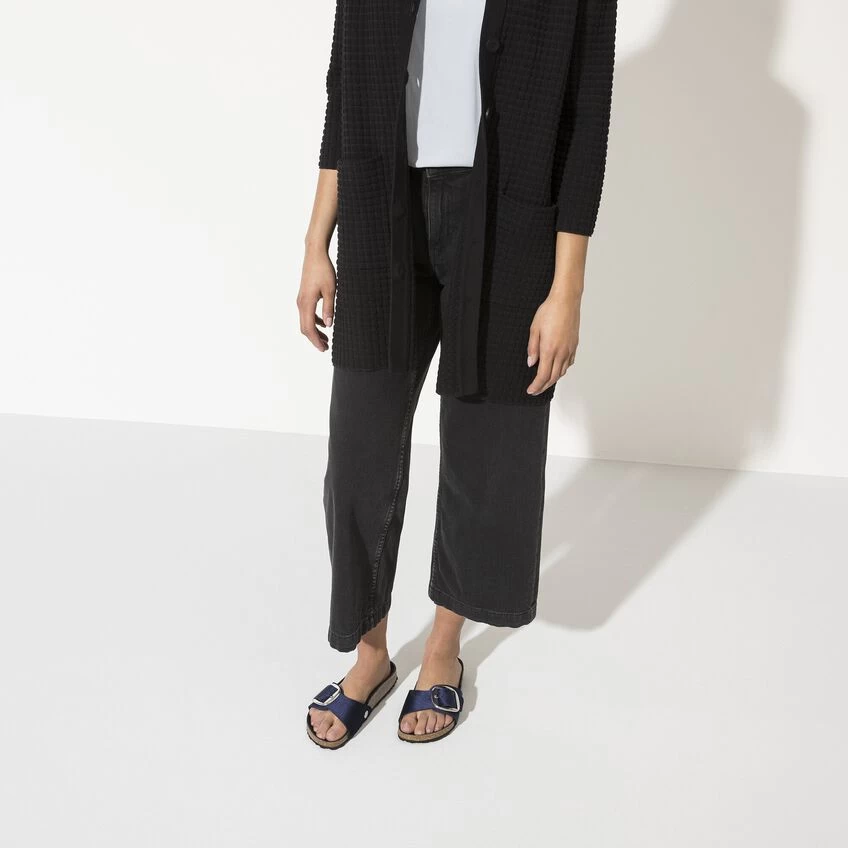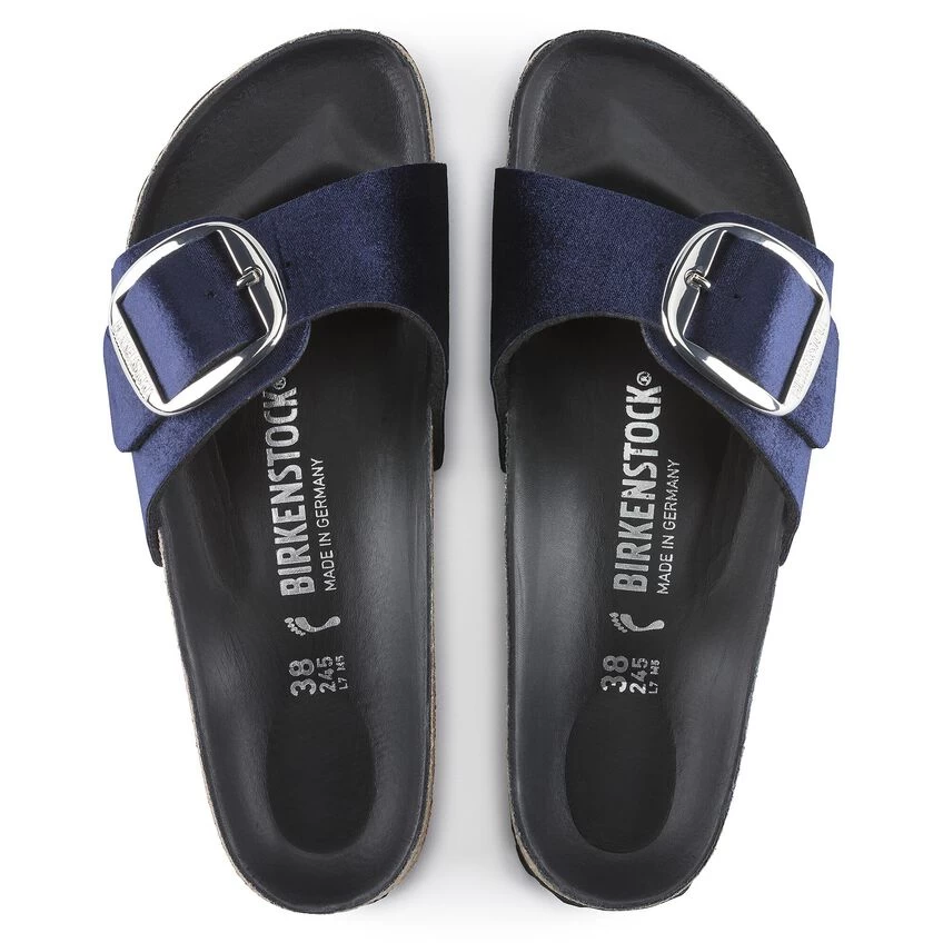 The original BIRKENSTOCK Sandal. A strap, a buckle, and a contoured cork footbed are masterfully combined to create the Madrid. This version is made of fine, luxurious velvet and boasts a big, elegant pin buckle. The footbed is fully lined with soft smooth leather.