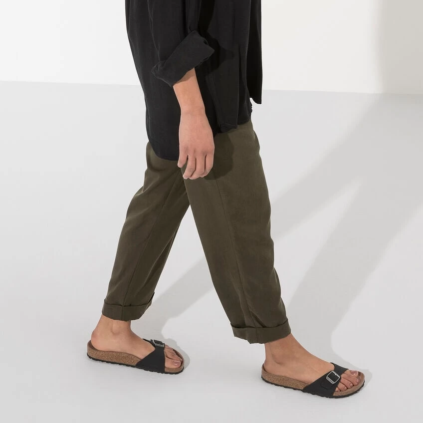 A strap, a buckle and a contoured cork footbed are masterfully combined to create the original Birkenstock sandal – the Madrid. An iconic slide with a classic buckle accent now available in a vegan material. The upper is made from the skin-friendly, hard-wearing synthetic material Birkibuc.