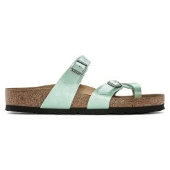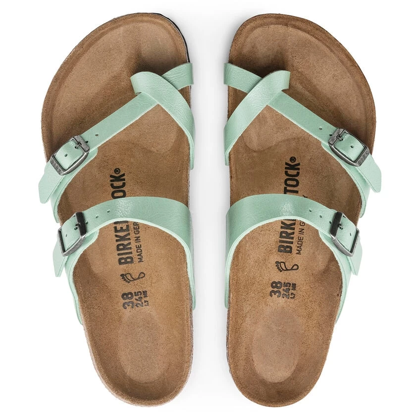 The Mayari from BIRKENSTOCK – an elegantly comfortable sandal with adjustable, crisscrossing straps that form a single loop around the toe. Classic support and adjustability, designed beautifully. This version features a subtle, frosted effect. The upper is made from the skin-friendly, hard-wearing synthetic material Birko-Flor®.