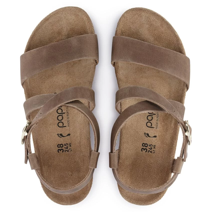 The Sibyl sandal from Papillo is a strappy wedge-heel sandal featuring narrow straps and elegant ring buckles. The upper is made from extra thick, oiled nubuck leather.